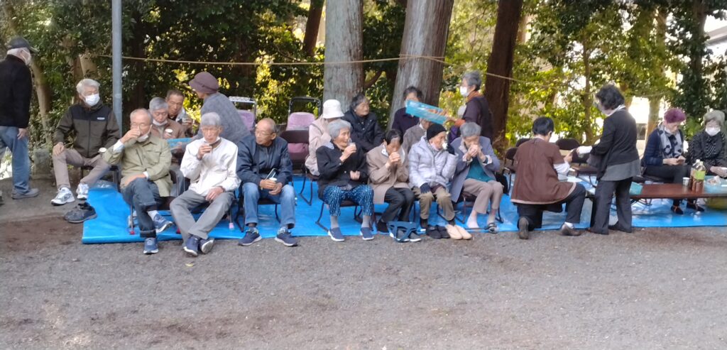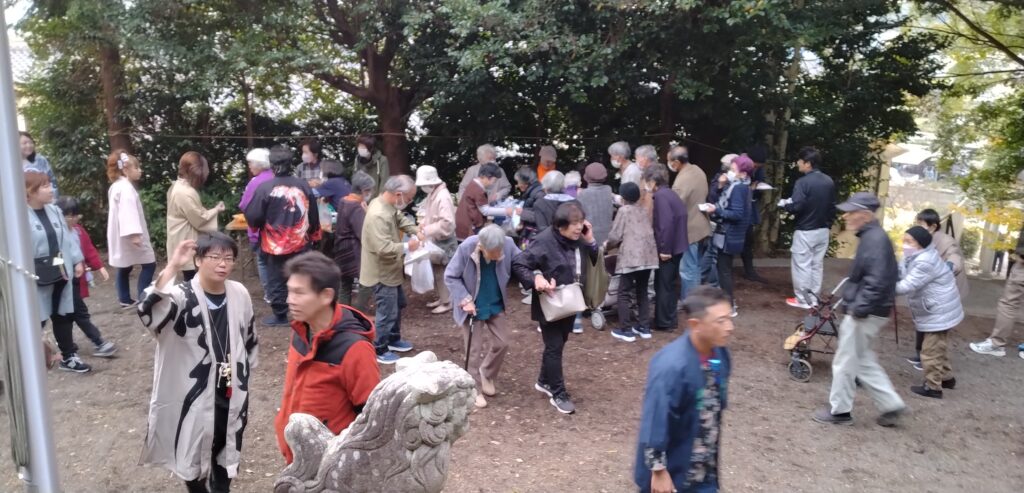 11月1,2日 坂部地区祭典 諏訪神社の祭典2日15時30分スタートです。「二礼二拍手一礼」の神事が行われ式が終了すると「御神酒による乾杯」と「お札と牛の下」を皆さんに配り、祭りは最高潮です。(熊野神社は10時の祭典)
